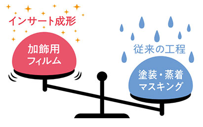 来の塗装・蒸着・マスキングなどの作業が不要となり、生産工程の軽減やコス